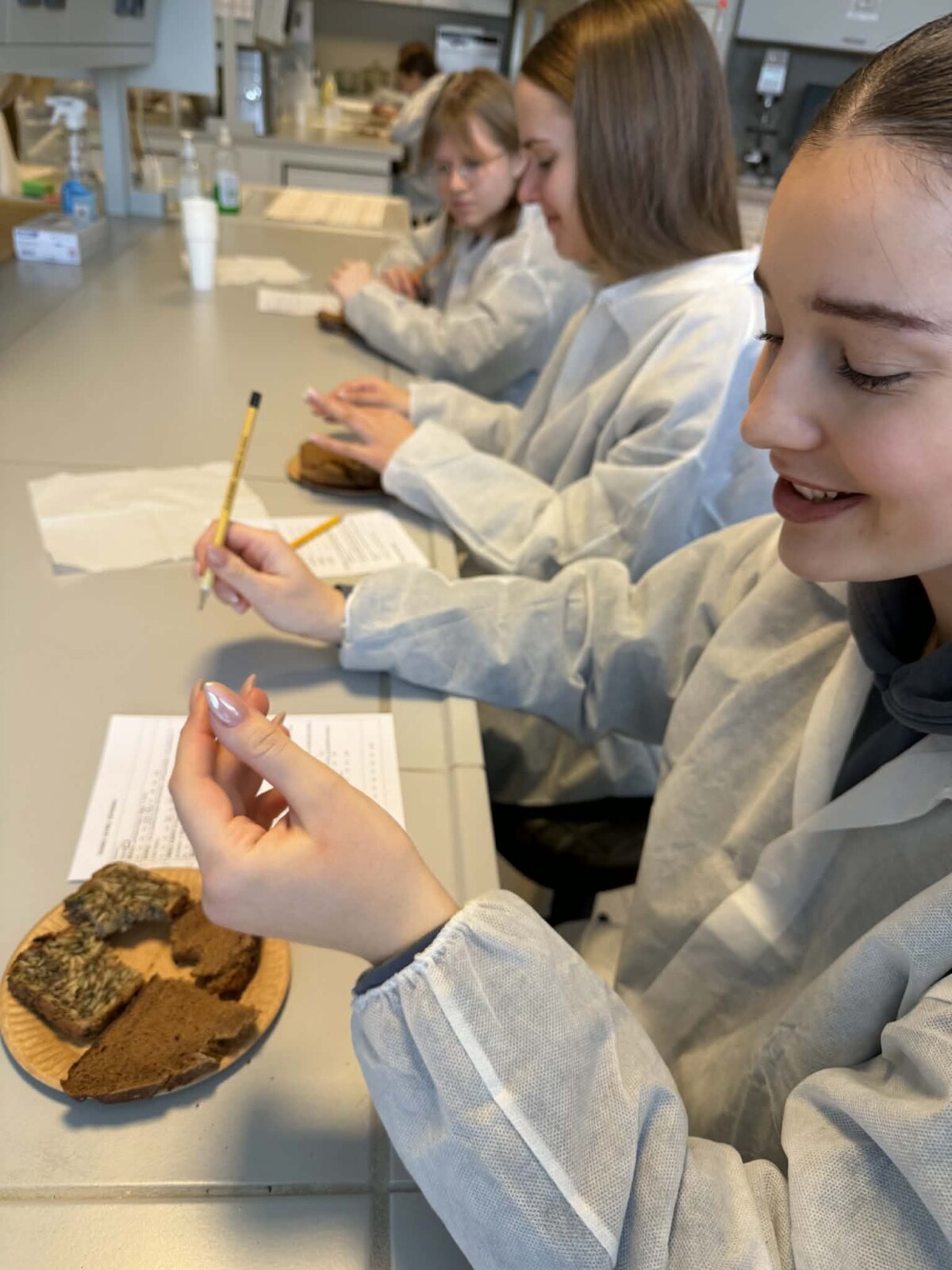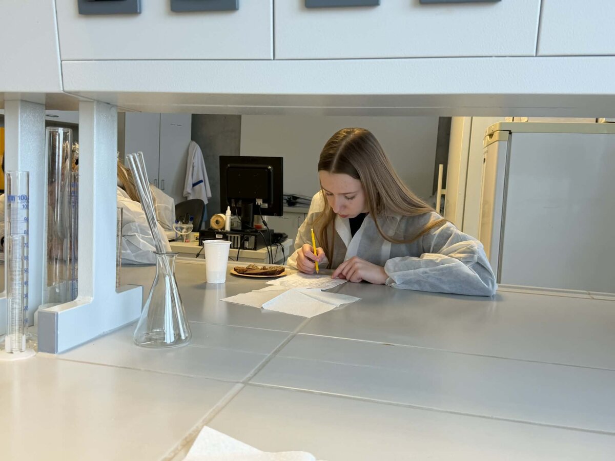 Antrojo praktinio užsiėmimo metu – „Duonos gaminių juslinė palyginamoji analizė“ – mokiniai susipažino su juslinio vertinimo metodais, plačiai taikomais maisto kokybės tyrimuose. Užsiėmimo metu buvo lyginami skirtingi duonos gaminiai, vertinant jų skonį, kvapą, tekstūrą, išvaizdą ir bendrą priimtinumą. Mokiniai mokėsi sistemingai aprašyti pojūčius, analizuoti skirtumus tarp gaminių ir suprasti, kaip juslinė analizė prisideda prie vartotojų poreikius atitinkančių produktų kūrimo bei kokybės užtikrinimo.
