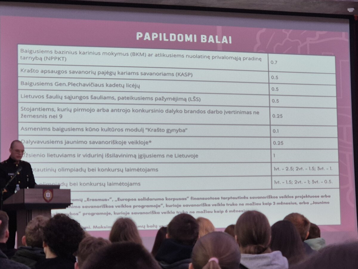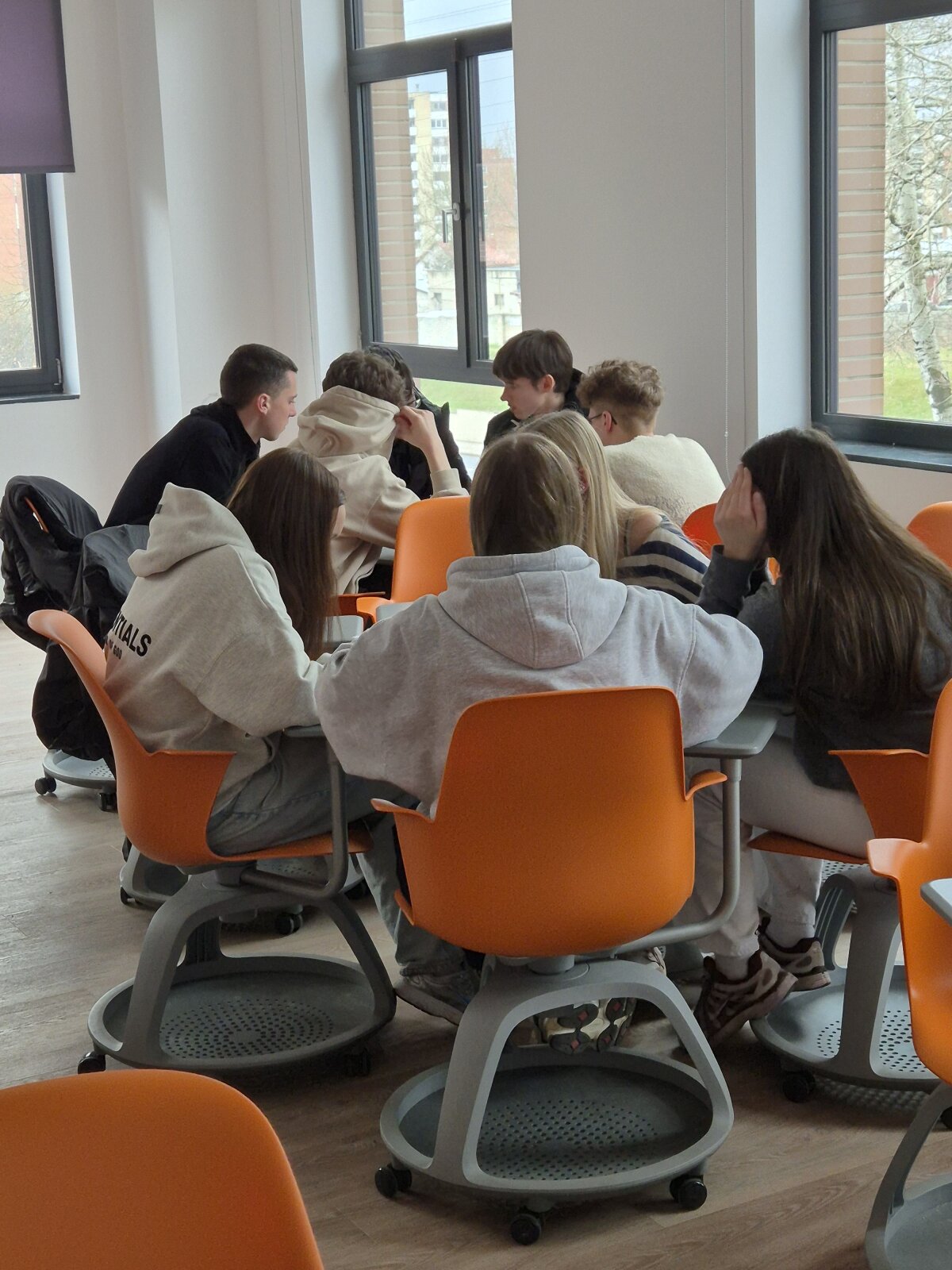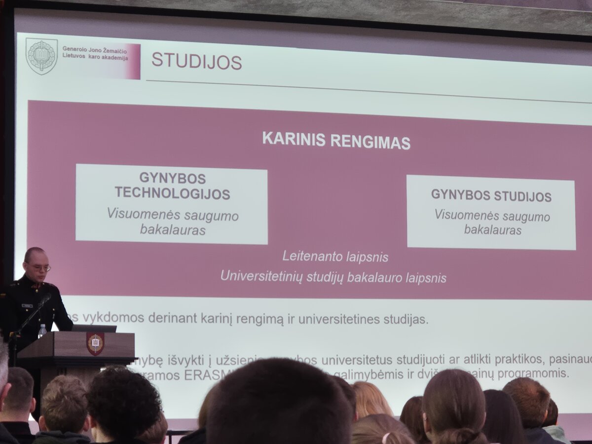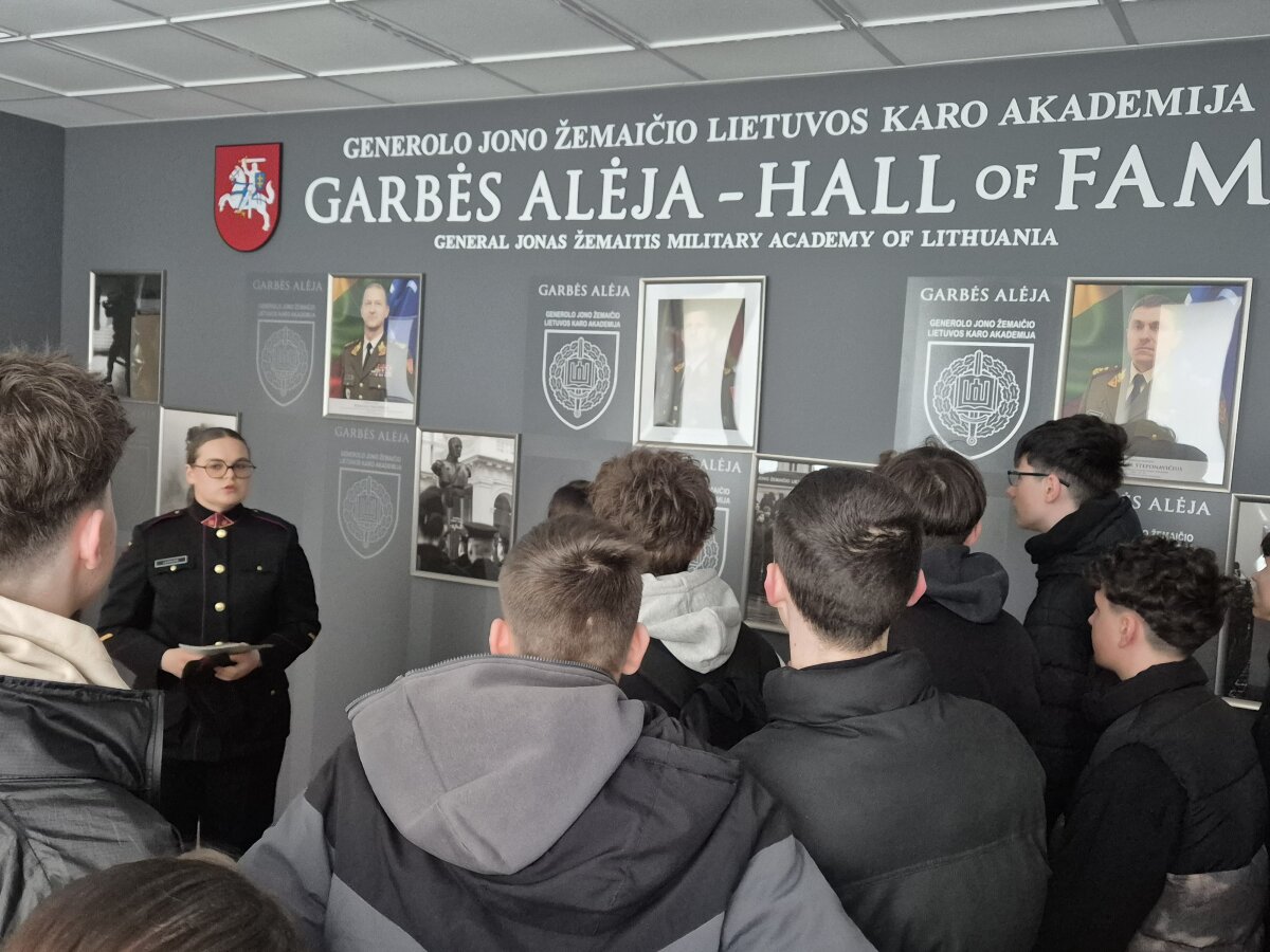 Balandžio 17 dieną I-II gimnazijos klasių socialinių mokslų grupės mokiniai lankėsi Generolo Jono Žemaičio Lietuvos karo akademijoje. Mokiniai dalyvavo atvirų durų dienos renginyje ir susipažino su akademijos aplinka. Ekskursijos metu buvo aprodyti Mokslo ir žinių rūmai, kareivinės, sporto kompleksas. Visi besidomintys studijomis galėjo sudalyvauti Lietuvos karo akademijos ir studijų pristatyme ir sužinoti apie karininko profesiją, karjerą, kariūnų kasdienę veiklą bei studijų programas. Mokiniai taip pat stebėjo VSAT kinologų ir tarnybinių šunų pasirodymą, lankė Lietuvos kariuomenės ekipuotės, ginkluotės ir karinės technikos parodas, vaišinosi kareiviška koše, arbata. Tuomet sekė apsilankymas Socialinių mokslų kolegijoje (SMK). Čia mokiniai dalyvavo kūrybinėse dirbtuvėse "Startuolis". Susibūrę komandomis bandė sugalvoti realią problemą egzistuojančią rinkoje bei sukurti įdėją startuoliui, kuris padėtų tą problemą išspręsti. Padirbėjus, laukė ekskursija po SMK erdves.