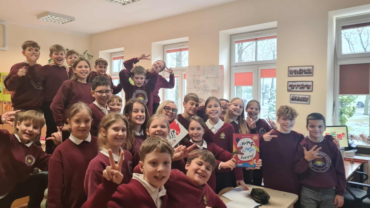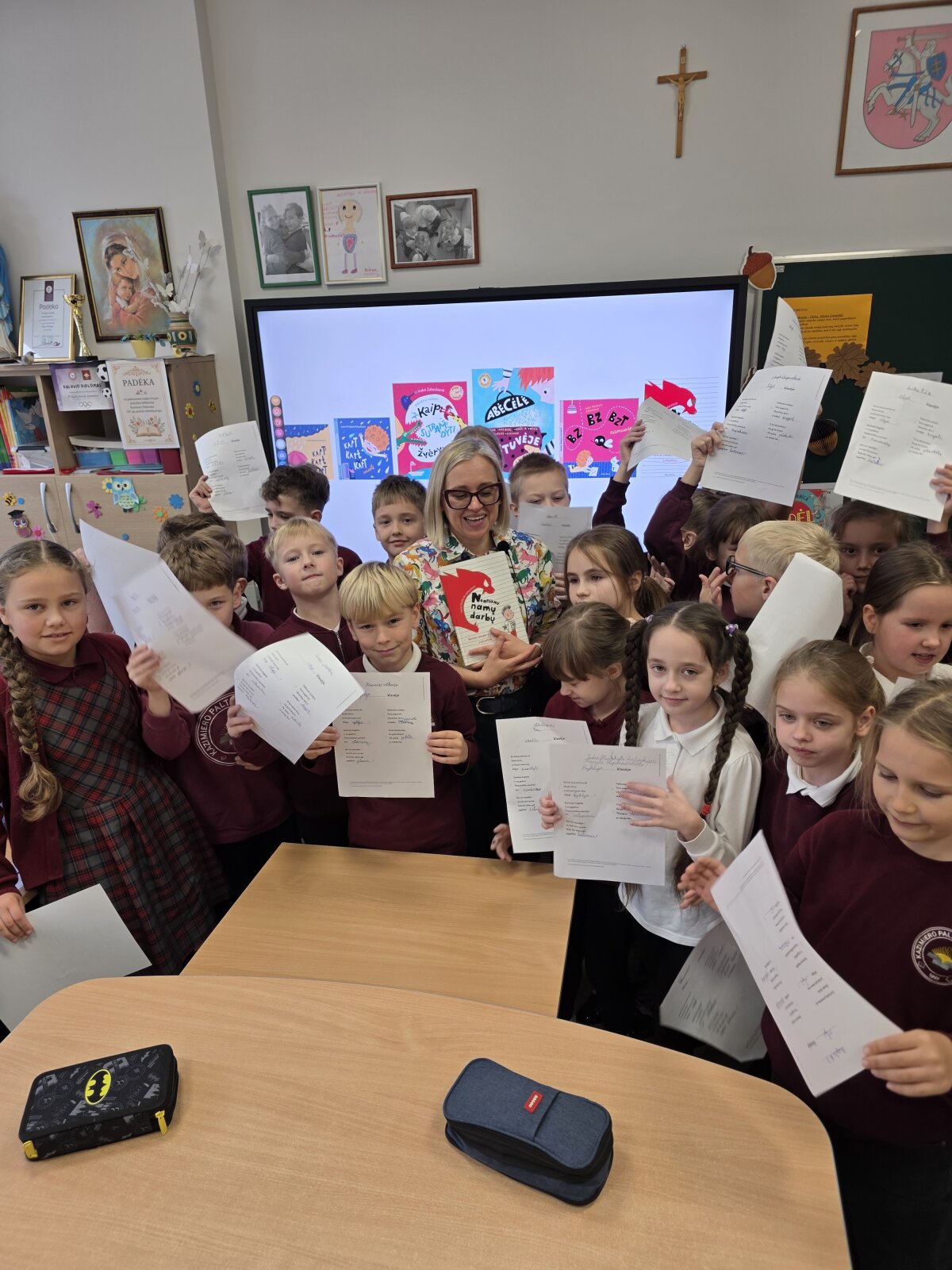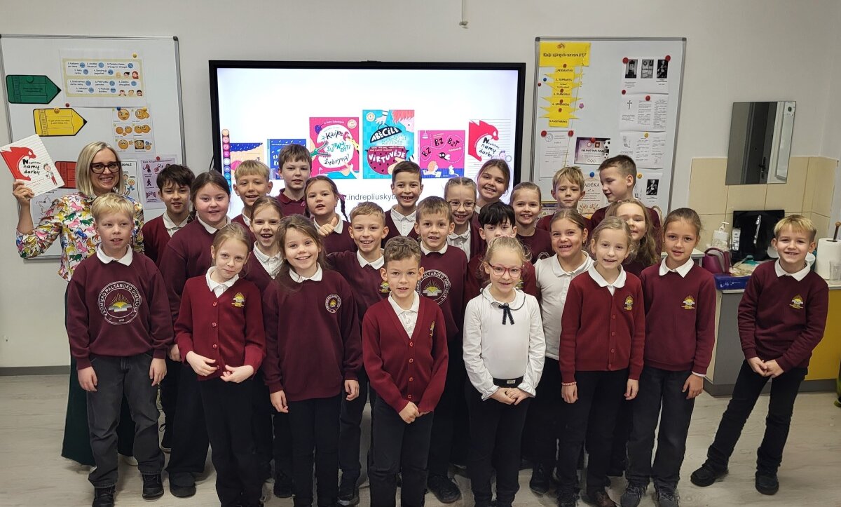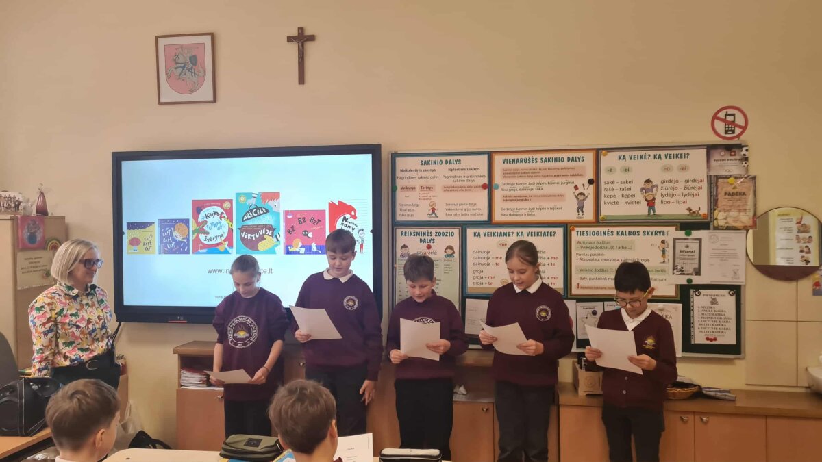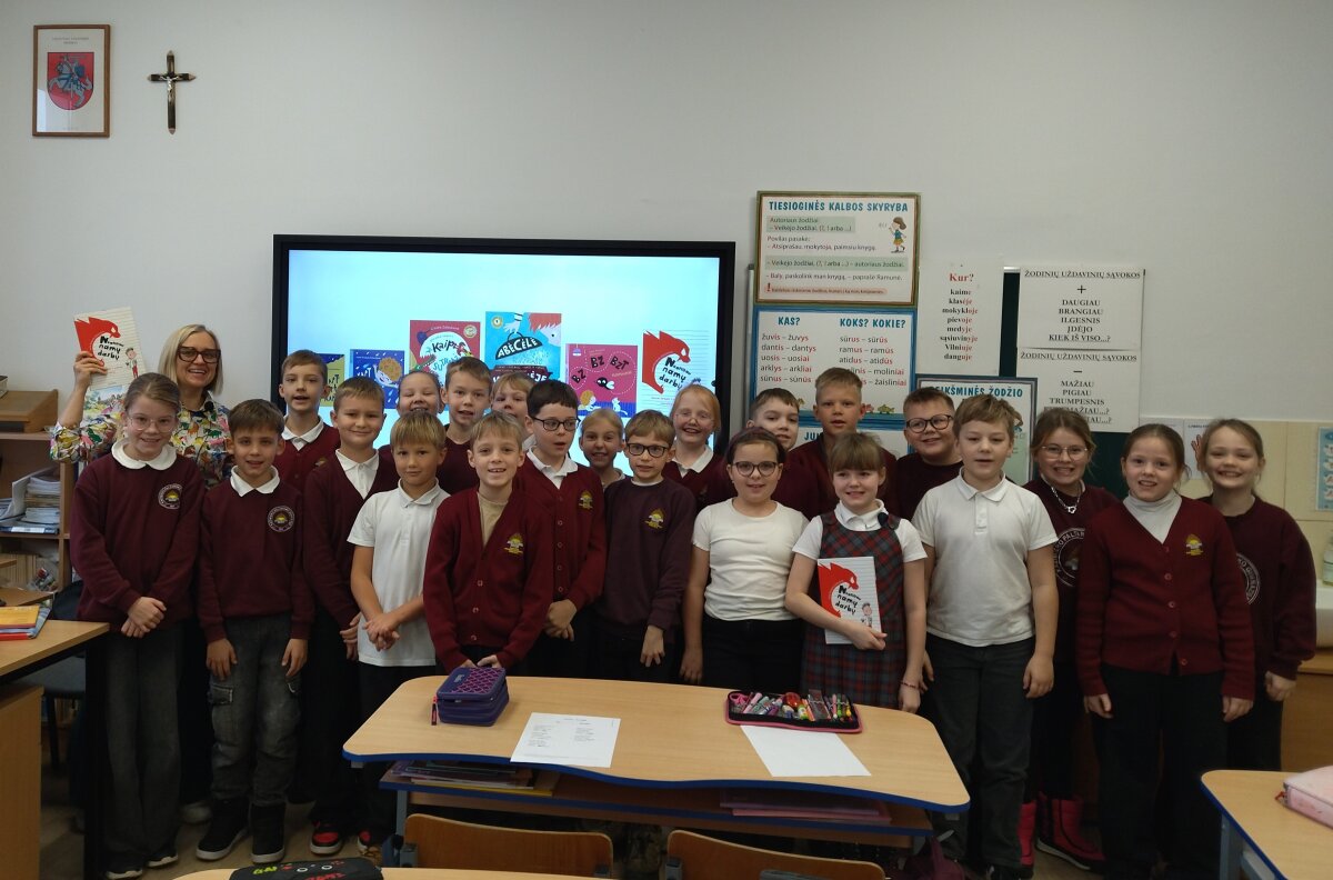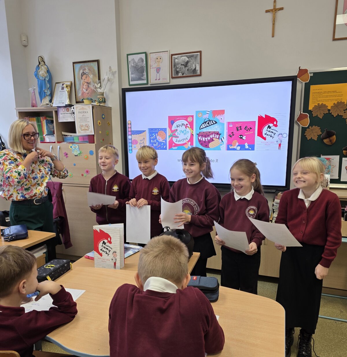 Lapkričio 17 dieną 2c, 2b, 3b, 4a, 4b ir 4c klasių vaikai susitiko su poete, savo knygų iliustratore ir šaunios knygos "Neatlikau namų darbų" autore Indre Pliuškyte-Zalieckiene. Jos linksmus, baisiai smagius ir juokingus eilėraščius vaikai mielai rinkosi dalyvaudami praėjusių metų skaitovų konkurse. Vaikai susipažino su autore, uždavė jai klausimų, klausėsi jos skaitomų eilėraščių, tapo tikrais poetais, nes jos padedami patys kūrė eiles, tinkančias pagal eilėraščio rimą ir ritmą.