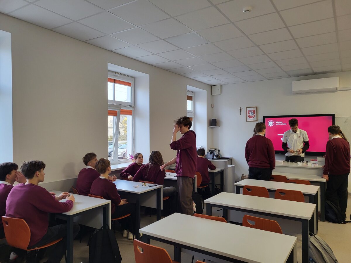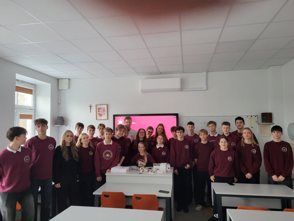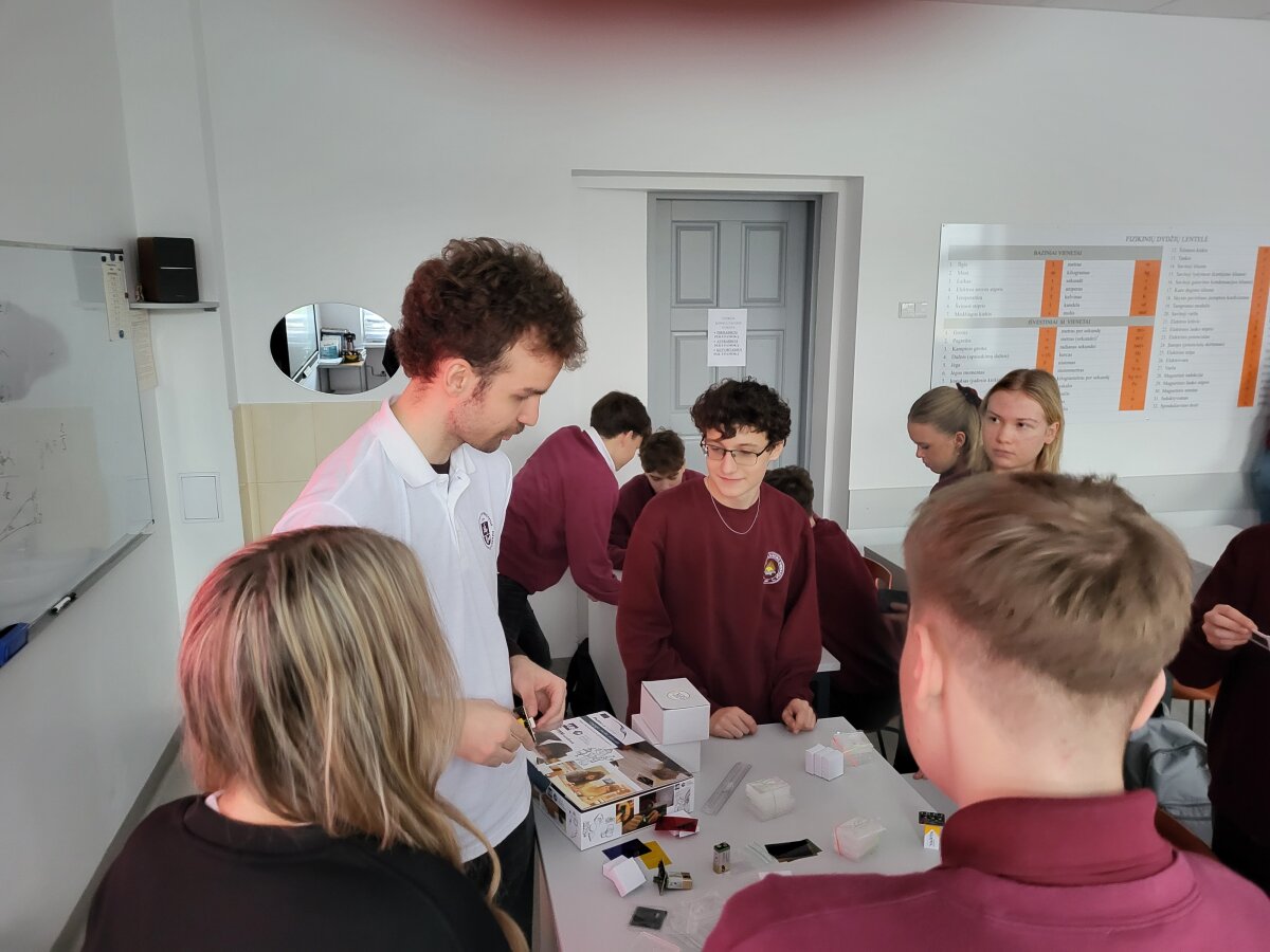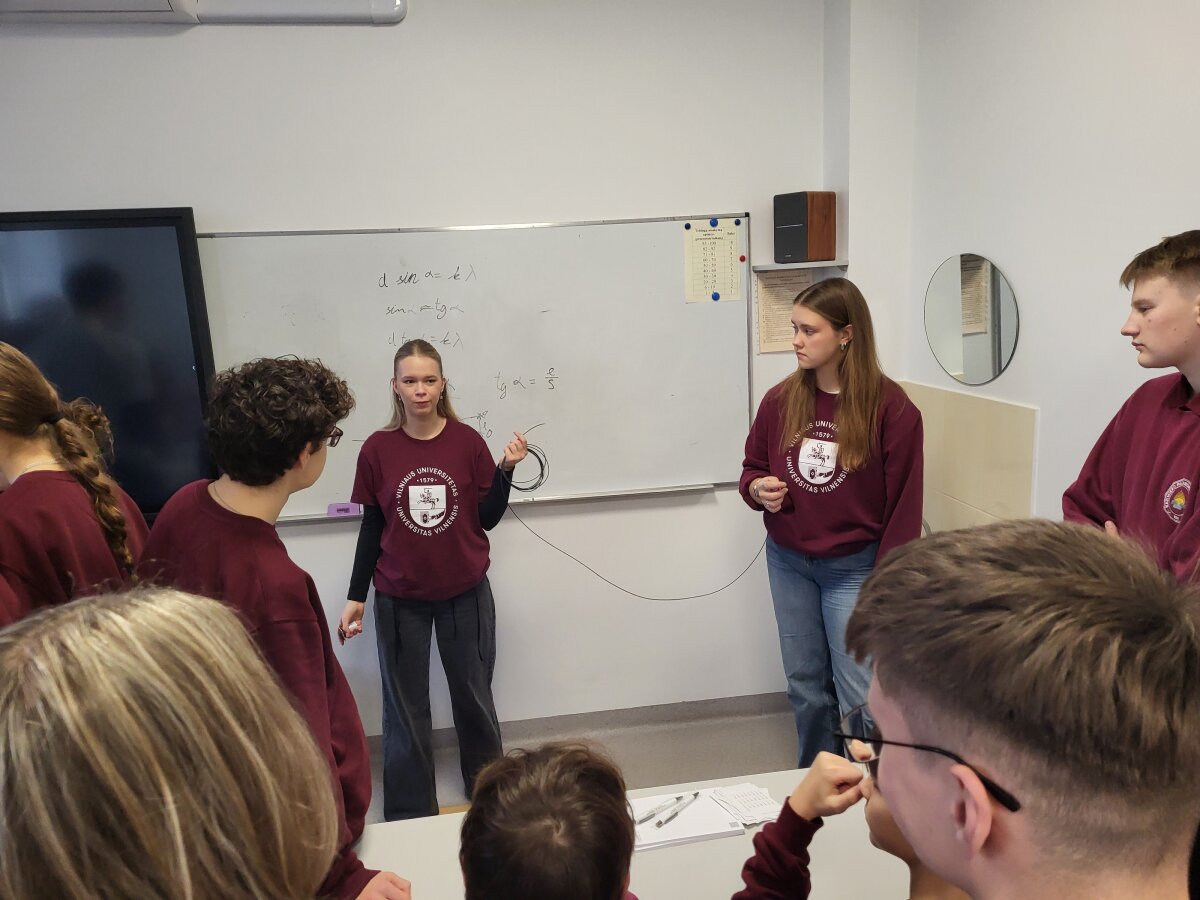 Gruodžio 11 d. mūsų gimnazijoje apsilankė Vilniaus universiteto Studentų atstovybės Fizikos fakultete studentai Dovydas Žiūra (mūsų gimnazijos alumni), Eglė Kulionytė, Kamilė Azimavičiūtė ir Dominykas Vaškas ir pravedė If1 grupės mokiniams fizikos pamoką. Susipažindino mokinius su pagrindiniais šviesos lūžio dėsniais, šviesolaidžių veikimo principais bei optikos taikymu technologijų srityse. Mokiniai praktiškai išbandė laboratorijose taikomus metodus ir pamatė, kad fizika gali būti įdomi, suprantama ir įtraukianti.