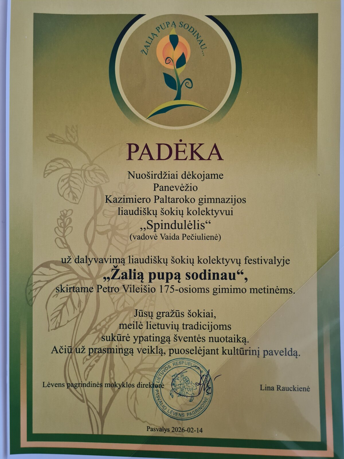 Vasario 13d. Pasvalio Lėvens pagrindinėje mokykloje vyko Respublikinis šokių festivalis „Žalią pupą sodinau", skirtas P.Vileišio 175-osioms metinėms paminėti. Paltaroko gimnazijos šokių kolektyvas „Spindulėlis" (vadovė Vaida Pečiulienė) pasveikino bendruomenę nuotaikingais tautiniais šokiais. Dėkojame gimnazijos administracijai bei pradinių klasių pavaduotojai Editai Dilienei už sudarytas sąlygas pasiruošti ir vykti į festivalį!