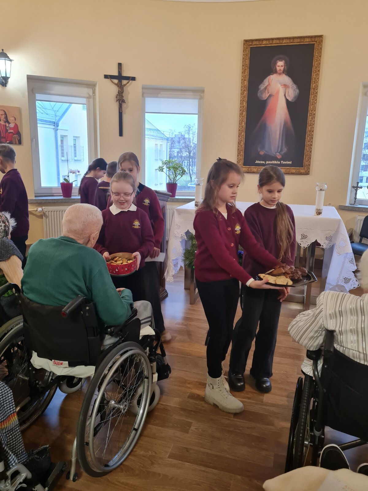 3d klasės mokiniai gerais darbais ruošiasi Kristaus Gimimo šv. Kalėdų šventei. Nuo advento pradžios kepė sausainius, ruošė sveikinimus, mokėsi maldos ir linkėjimų žodžius. Pradedant antrą laukimo savaitę  su mokytoja Vaida aplankė šv. Juozapo globos namų gyventojus II žvakės įžiebimui. Išsakę savo linkėjimus bendravo su gyventojais juos vaišindami savo ir mamų keptais sausainiais, mėgstamais saldainiais, lankė kambariuose negalinčius ateiti prie advento vainiko.